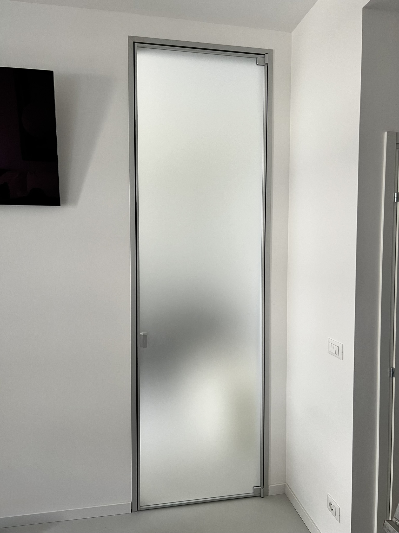Porta in vetro satinato extrachiaro da 10mm temperata e molata a filo lucido fissata alla spalletta con cerniere...